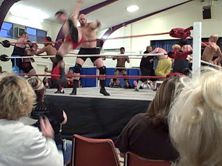 One more example. SPW put on a No Rope Lumberjack Match between El Chupacabra and Rik Luxury a year or two ago, in which the ropes were removed from the ring. The “lumberjacks” were two crowds of men, each group friends of one wrestler and hostile to the other, and itching to stomp someone. Luxury was outside of the ring, with his lumberjacks between him and his opponent. El Chupacabra then ran out of the ring onto the shoulders of said lumberjacks, pushing off and tackling Luxury from above.